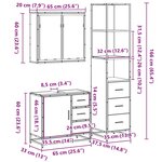 Cet ensemble de meubles de salle de bain pratique est un excellent supplément à votre salle de bain, ce qui lui donne une apparence ordonnée et saisissante ! Matériau stable et durable : le bois d'ingénierie est un matériau durable et stable dont la surface lisse résiste à l'humidité, à la déformation et au fendillement, ce qui en fait un choix fiable pour une grande variété de projets.Cadre stable et durable : le cadre en métal de l'armoire rehausse votre intérieur d'un style industriel et offre une durabilité, une stabilité et une résistance à la corrosion exceptionnelles.Grand espace de rangement : ce meuble de salle de bain offre suffisamment d'espace de rangement pour garder vos essentiels bien organisés et à portée de main.Dessus de meuble pratique : le dessus du meuble d'évier a un trou, il est donc idéal pour placer l'évier.Fonction murale : l'armoire de toilette peut être fixée au mur pour économiser de l'espace au sol, ce qui la rend particulièrement adaptée aux pièces avec un espace limité. Attention :Pour éviter qu'il ne bascule, ce produit doit être utilisé avec le dispositif de fixation murale fourni. Bon à savoir :Les vis et les chevilles pour l'intérieur du mur ne sont pas incluses. Nous vous conseillons de trouver et d'utiliser des vis et des chevilles adaptées spécifiquement à vos murs. Si vous n'êtes pas sûr, vous pouvez consulter un professionnel. Veuillez lire et suivre chaque étape des instructions.Couleur : sonoma grisMatériau : bois d'ingénierie, métalDimensions de l'armoire à miroir : 65 x 20 x 60 cm (l x P x H)Dimensions de l'armoire de lavabo : 65 x 33 x 60 cm (l x P x H)Dimensions de l'armoire de salle de bain : 35 x 37,5 x 166 cm (L x l x H)Capacité de charge maximale (totale) : 60 kgAssemblage requis : ouiLa livraison contient :1 x armoire à miroir1 x meuble-vasque1 x armoire de salle de bain