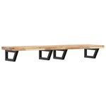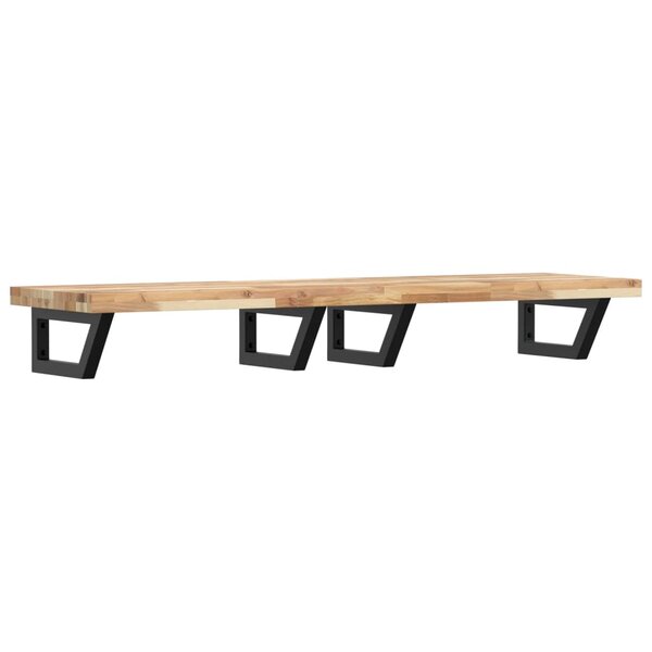 L'étagère murale pour vasque se fixe solidement au mur, offrant une solution élégante et peu encombrante pour votre salle de bains. Robuste et durable : cette étagère de lavabo est associée à une structure en acier et à un plateau en bois massif d'acacia, ce qui la rend robuste, stable et durable.Gain de place : l’étagère "flottante" du lavabo offre suffisamment d’espace pour ranger les crèmes et les petits articles. Grâce à la forme de trapèze, vous pouvez accrocher des serviettes ou d’autres choses sur le support pour gagner de la place.Facile à utiliser : le plan de travail n'est pas percé, ce qui permet d'installer la vasque à gauche, à droite ou au centre, selon les besoins de la pièce. Grâce aux trous pré-percés dans le support, il peut être facilement assemblé avec le plateau de table et fixé au mur.Multifonctionnel : grâce à son design moderne, il offre un espace supplémentaire pour différents types de salles de bains. Bon à savoir :Les vis ne sont pas incluses, vous pouvez les acheter séparément en fonction des informations fournies ci-dessous.Fixation murale : vis d'expansion M8 de 2 Pièces par supportDessus en bois : vis M5x18 (T=2) de 2 Pièces ou vis M5x20 (T=2,5/4cm) de 2 Pièces par support.Plan de travail :Matériau : bois d'acacia massif (non traité)Dimensions : 160 x 40 x 4 cm (L x l x é)Support d'étagère :Couleur : noirMatériau : acierDimensions du support d'étagère : 15 x 35 cm (l x L)Dimensions du tube : 3 x 3 cm (l x L)Forme : trapèzeCapacité de charge : 100 kgDistance entre les trous de fixation murale : 60 mmLa distance entre les trous du plateau et le bord est de 100 mm de chaque côtéAvec 2 trous pour le montage mural et 2 trous pour le montage d'un plateauLes vis ne sont pas inclusesAssemblage requis : ouiLa livraison contient :1 x Comptoir pour 1 lavabo4 x support d'étagère