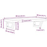 L'étagère murale pour vasque se fixe solidement au mur, offrant une solution élégante et peu encombrante pour votre salle de bains. Robuste et durable : cette étagère de lavabo est associée à une structure en acier et à un plateau en bois de hêtre massif, ce qui la rend robuste, stable et durable. Gain de place : l’étagère "flottante" du lavabo offre suffisamment d’espace pour ranger les crèmes et les petits articles. Grâce à la forme de trapèze, vous pouvez accrocher des serviettes ou d’autres choses sur le support pour gagner de la place. Facile à utiliser : le plan de travail n'est pas percé, ce qui permet d'installer la vasque à gauche, à droite ou au centre, selon les besoins de la pièce. Grâce aux trous pré-percés dans le support, il peut être facilement assemblé avec le plateau de table et fixé au mur. Multifonctionnel : grâce à son design moderne, il offre un espace supplémentaire pour différents types de salles de bains. Bon à savoir :Les vis ne sont pas incluses, vous pouvez les acheter séparément en fonction des informations fournies ci-dessous. Fixation murale : vis d'expansion M8 de 2 Pièces par support Dessus en bois : vis M5x18 (T=2) de 2 Pièces ou vis M5x20 (T=2,5/4cm) de 2 Pièces par support.Plan de travail :Matériau : bois de hêtre massif avec finition laquéeDimensions : 80 x 40 x 4 cm (L x l x é)Support d'étagère :Couleur : noirMatériau : acierDimensions totales : 15 x 35 cm (l x L)Dimensions du tube : 3 x 3 cm (l x L)Distance entre les trous de fixation murale : 60 mmLa distance entre les trous du plateau et le bord est de 100 mm de chaque côtéForme : trapèzeCapacité de charge : 100 kgLes vis ne sont pas inclusesAvec 2 trous pour le montage mural et 2 trous pour le montage sur tableAssemblage requis : ouiLa livraison contient :1 x Comptoir pour 1 lavabo2 x support d'étagère