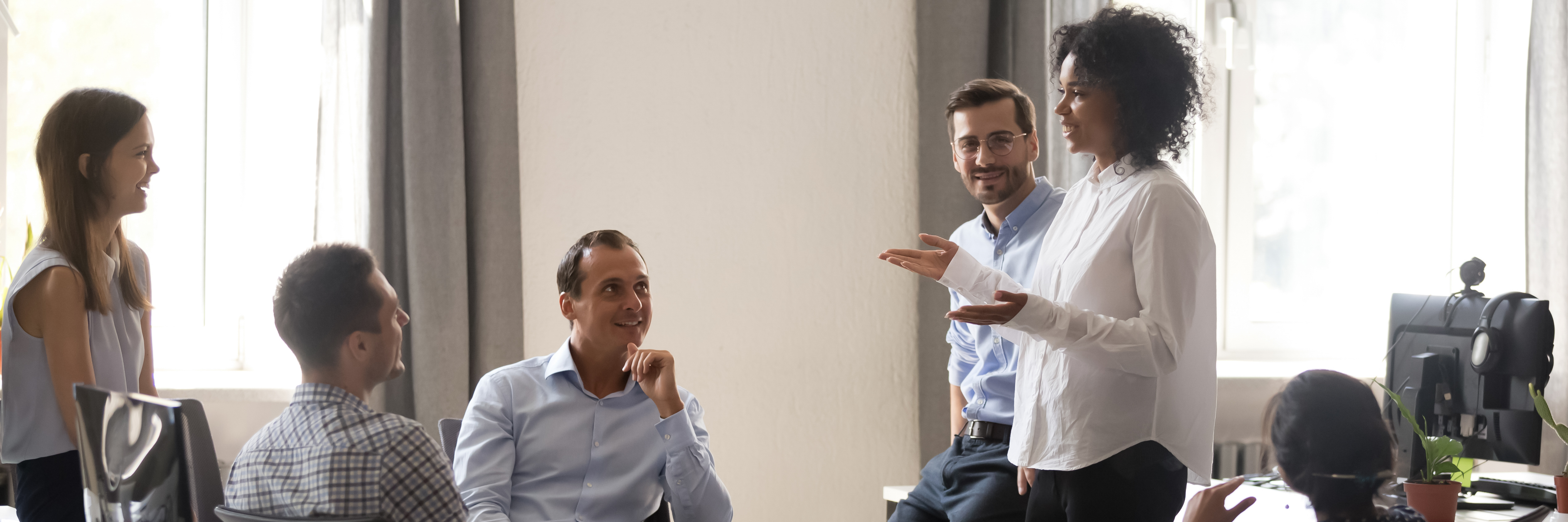 groupe autour d'une table discutant du processus de dématérialisation du bulletin de paie, avec une femme souriante au centre