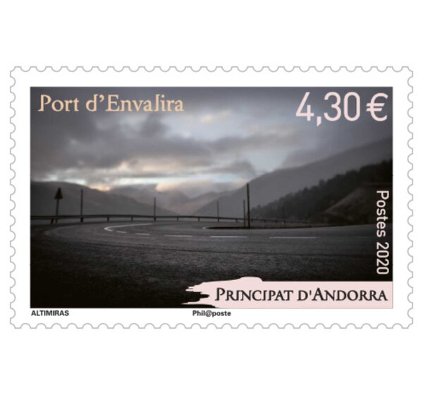 Ce timbre inaugure la nouvelle série " Paysages et cols de montagne " - Paisatge i ports de muntanya - qui remplace la série Légende - Llegenda. Le Port d'Envalira (du catalan port = col) est le plus haut col routier des Pyrénées, il se dresse à 2 409 mètres d'altitude, quelques kilomètres après la frontière franco-andorrane, entre Soldeu (Canillo) et le Pas de la Case (Encamp). Le col était fréquenté à pied ou à dos de mulet, été comme hiver. La route du col d’Envalira a été inaugurée par l’administration des Ponts et Chaussées des Pyrénées-Orientales le 19 octobre 1910. Elle a permis l’accés au premier véhicule à moteur mécanique d’Andorre, un Doriot, Flandin et Parant (DFP), conduit par le Dr. François Gomma, délégué du "Touring club de France" dans une expédition pionnière pour parcourir la plus haute route d'Europe du moment. Ce n'est que dans les années 1940 qu'il a été possible de maintenir le col ouvert pratiquement toute l'année, sauf les jours de tempête de neige. Le Conseil était responsable de l’enlèvement de la neige, fait à la main jusqu'en 1942, puis grâce à deux motoneiges. Dans les années 1950, la construction d’un tunnel a été étudiée pour permettre l’ouverture du col franco-andorran 365 jours par an, mais ce n’est qu’en 2000 qu’une subvention a été accordée à une entreprise privée pour le construire et l'exploiter commercialement pendant 50 ans. Ce tunnel d’une longueur de 2.879 mètres est considéré comme le plus haut d’Europe, situé entre 2.043 et 2.052 mètres d’altitude.