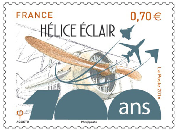 L’hélice Éclair, première production en série de Marcel Dassault, a connu son heure de gloire dans la défense du ciel de Verdun, il y a 100 ans, en 1916. C’est le point de départ d’une aventure constamment tournée vers le futur, symbolisée sur le timbre par la silhouette de 3 avions mythiques de Dassault Aviation : le Rafale, le Falcon et le nEUROn. Pose d'une encre bleue métallisée sur "100" et la silhouette des avions.