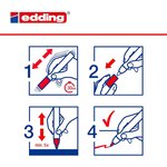 La craie liquide sous forme de marqueur permet un maniement plus aisé que la craie traditionnelle Les marqueurs craie d'edding permettent de réaliser en toute facilité des caractères élégants et professionnels tout en gardant les mains propres Un choix de 9 couleurs brillantes est proposé Le Blanc, le jaune fluo, l'orange fluo et le rose fluo resplendissent sous la lumière UV La largeur d'écriture moyenne convient pour les inscriptions et les dessins créatifs Le marqueur craie liquide edding est un instrument très prisé des restaurants, des commerces de détail et des concessionnaires automobiles Partout où il faut des inscriptions réalisées avec précision A la maison, on pourra aussi décorer, par exemple, des fenêtres pour n'importe quelle saison ou occasion La surface pourra être décorée à main levée ou à l'aide d'un modèle Dans ce dernier cas, coller le modèle derrière la vitre, puis repasser sur le dessin dans la couleur voulue Le site Internet d'edding propose une multitude de pochoirs à télécharger Secouer le marqueur avec le capuchon fermé Retirer le capuchon Pomper le marqueur pointe vers le bas, par ex sur un morceau de papier brouillon Pomper avec précaution jusqu'à ce que l'encre remplisse la pointe Le marqueur est maintenant prêt à l'emploi Il ne faut pas trop pomper sur la pointe pour éviter de former des gouttelettes sur les lettres Si on doit corriger, il suffit d'effacer l'encre avec un chiffon humide Pour les matériaux délicats (par ex le plexiglas®), nous recommandons de faire un test au préalable à un endroit peu visible Stocker à l'horizontale Produit de marque haut de gamme Produit fabriqué en Allemagne